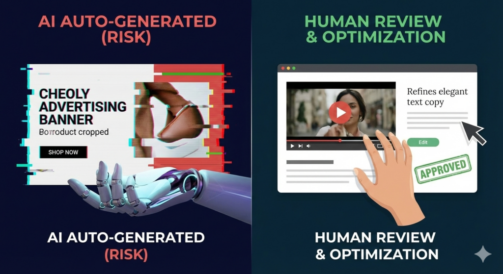 AI가 텍스트와 이미지를 조합해 광고 소재를 자동으로 만들어주는 기능은 편리하지만, 아직 완벽하지 않습니다.